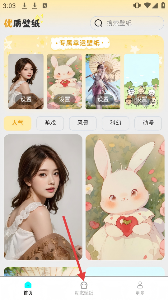 1、打开壁纸应用,在首页能看到【优质壁纸】及各类分类,点击底部【动态壁纸】,进入动态壁纸页面。