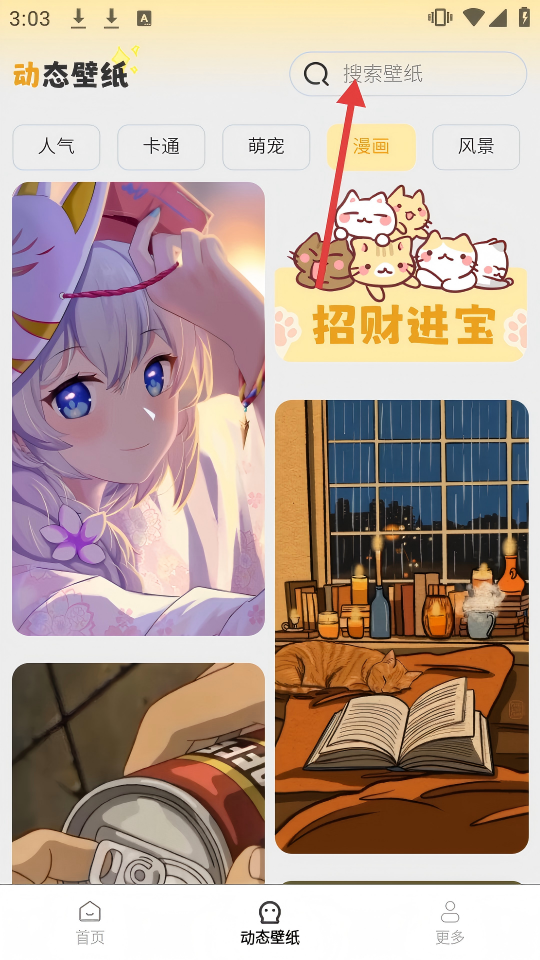 2、在动态壁纸页面,若想找特定壁纸,点击顶部【搜索壁纸】框,输入关键词准备搜索。