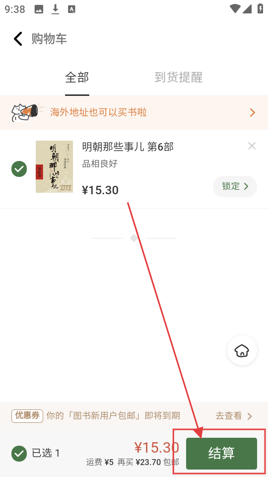 3、进入购物车页面,确认要购买的图书,然后点击【结算】按钮,进入下单页面呢。