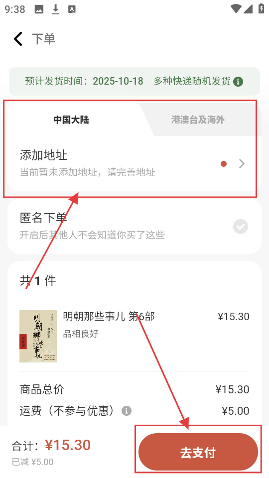4、在下单页面,添加收货地址,确认商品总价和运费等,最后点击【去支付】按钮,完成图书购买啦。