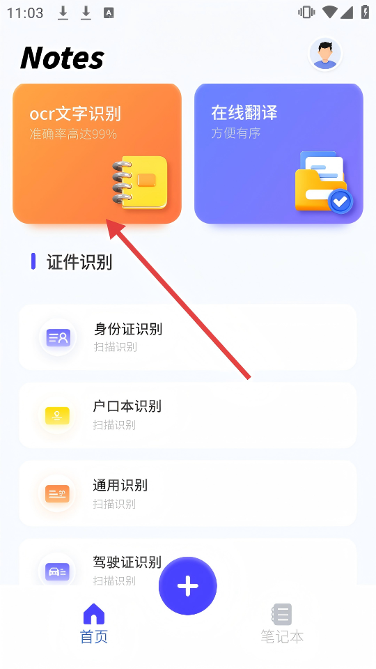 1、进入软件首页,可使用【ocr文字识别】(准确率达99%),也能进行身份证、户口本等证件识别,还可使用【在线翻译】功能。