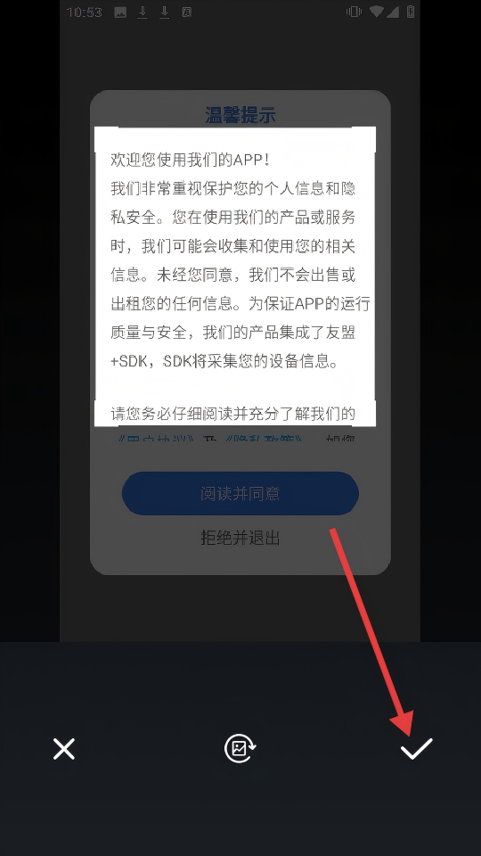 3、遇到【温馨提示】弹窗时,仔细阅读内容后,可点击“阅读并同意”,再点右下角对勾继续使用功能。