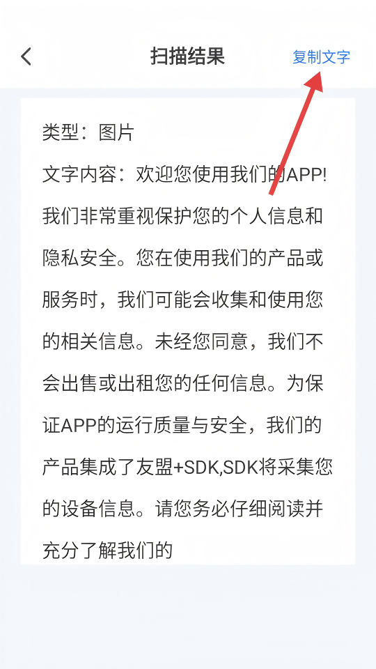 4、扫描完成后进入【扫描结果】页面,若需使用文字,点击右上角【复制文字】即可快速获取。