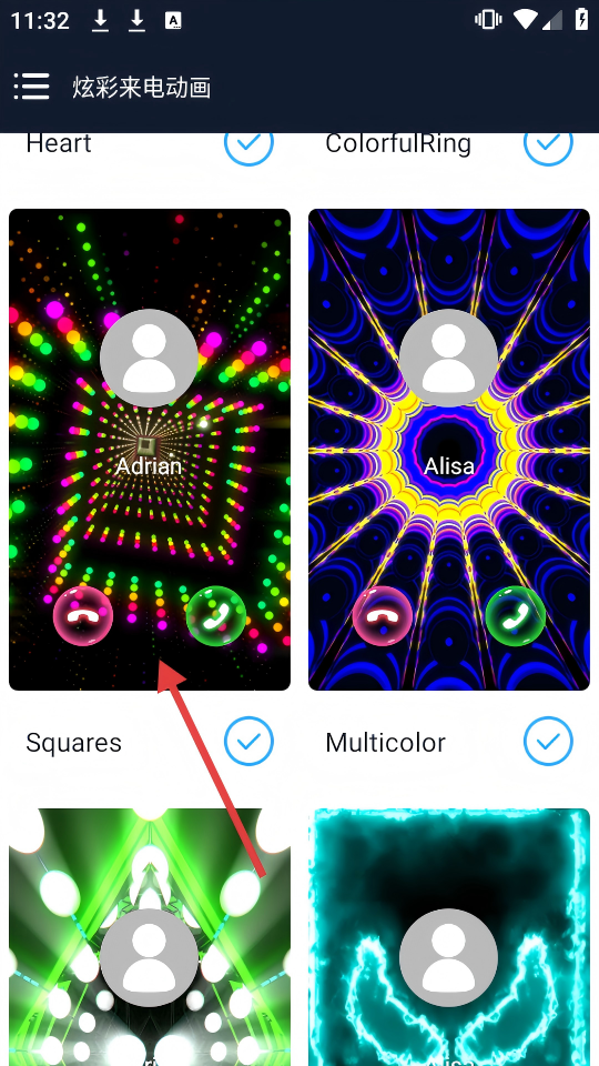 2、进入【炫彩来电动画】页面,可看到Heart、Squares等多种动画样式,挑选喜欢的来电动画,点击进入详情设置。