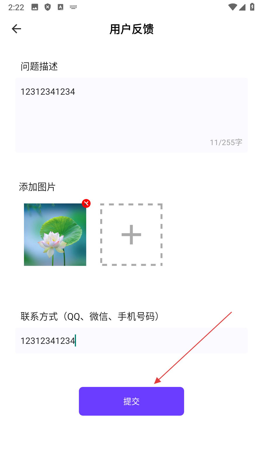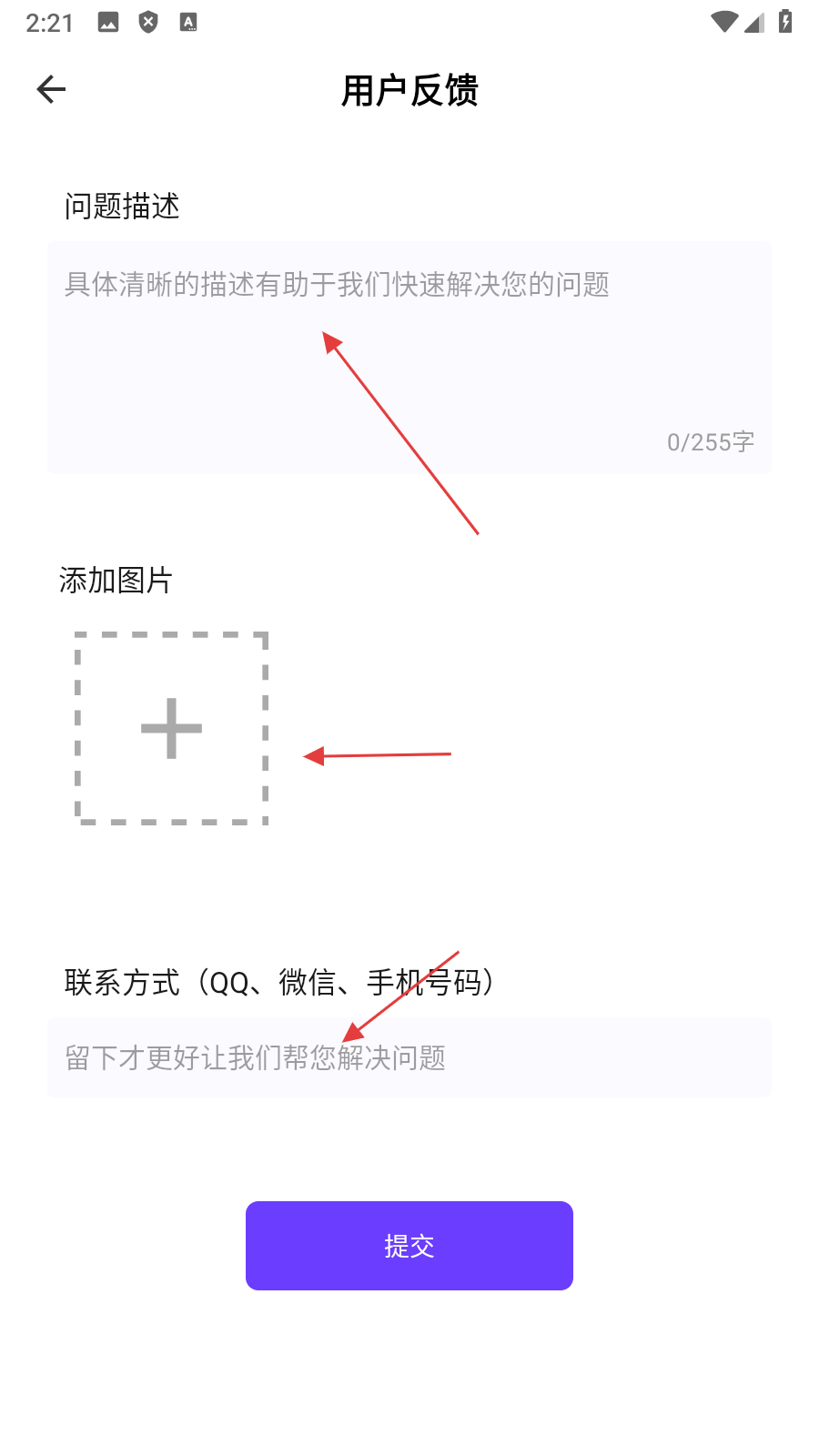 3、在用户反馈页面【填写问题描述、添加图片及联系方式】,准备提交反馈。