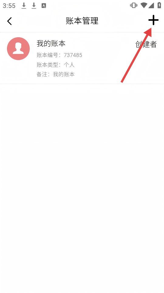 3、进入“账本管理”界面,看到已有“我的账本”,点击右上角“+”按钮,进行新账本创建。