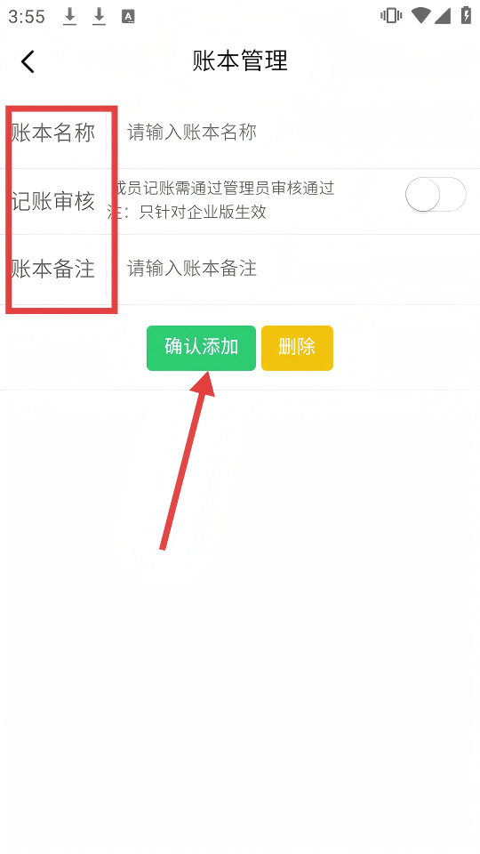 4、在新账本设置页,填写【账本名称】【账本备注】,点击【确认添加】,完成新账本添加。
