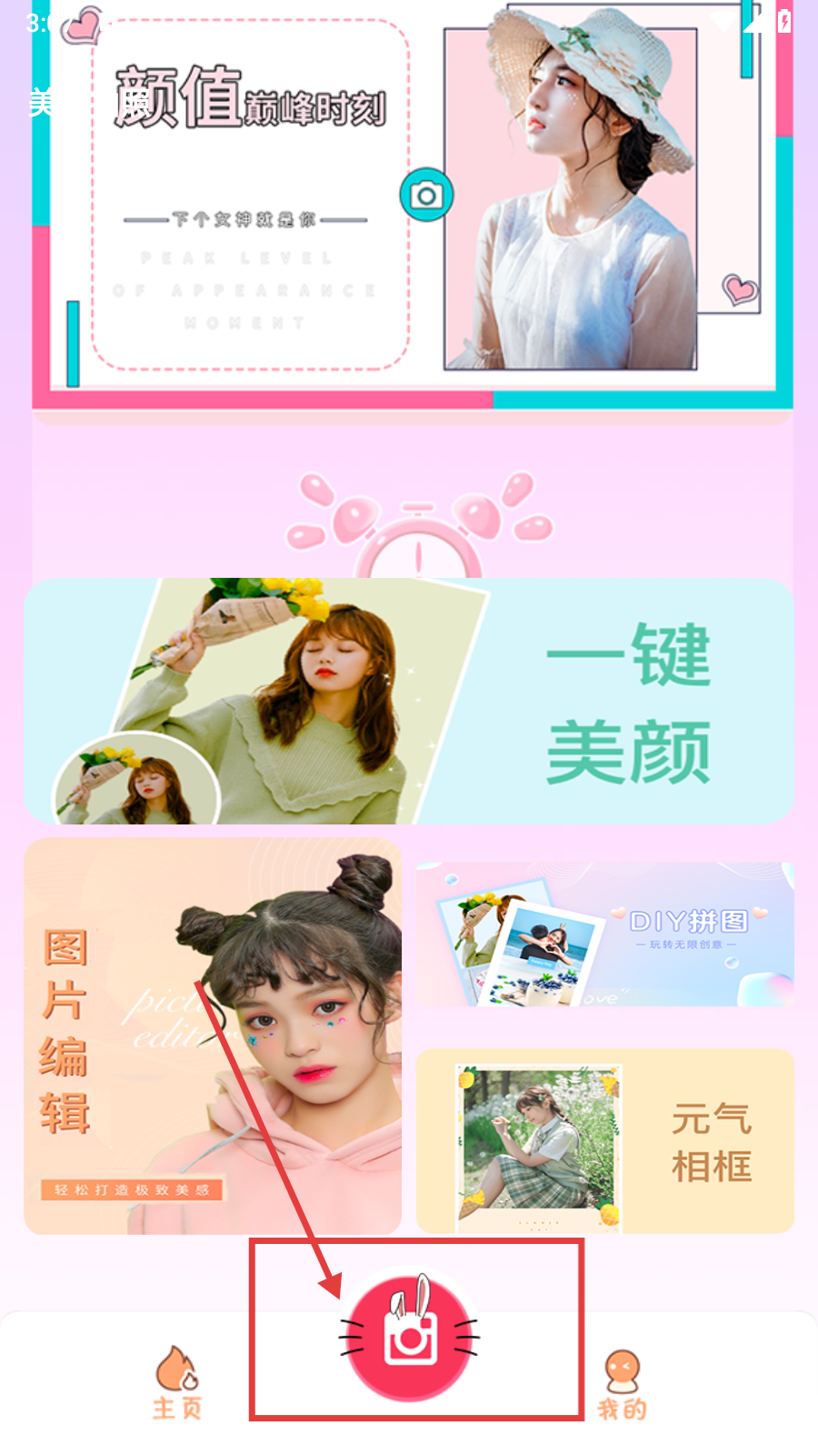 2、进入软件主界面后,点击底部中间的相机图标,进入相机或图片编辑相关页面。