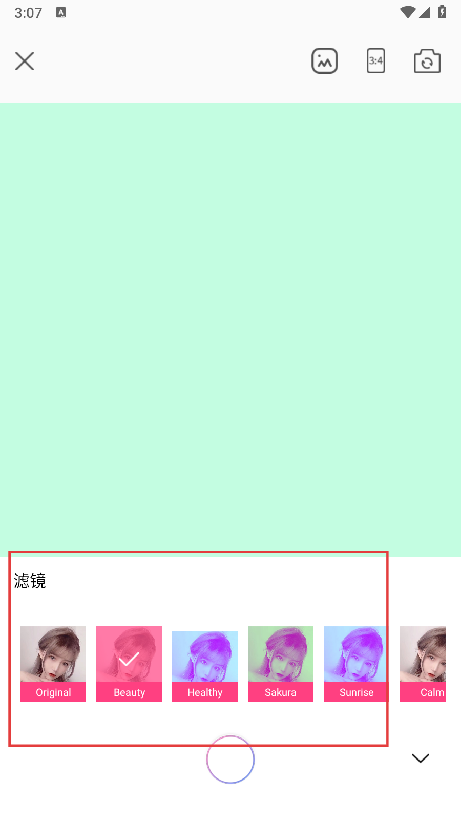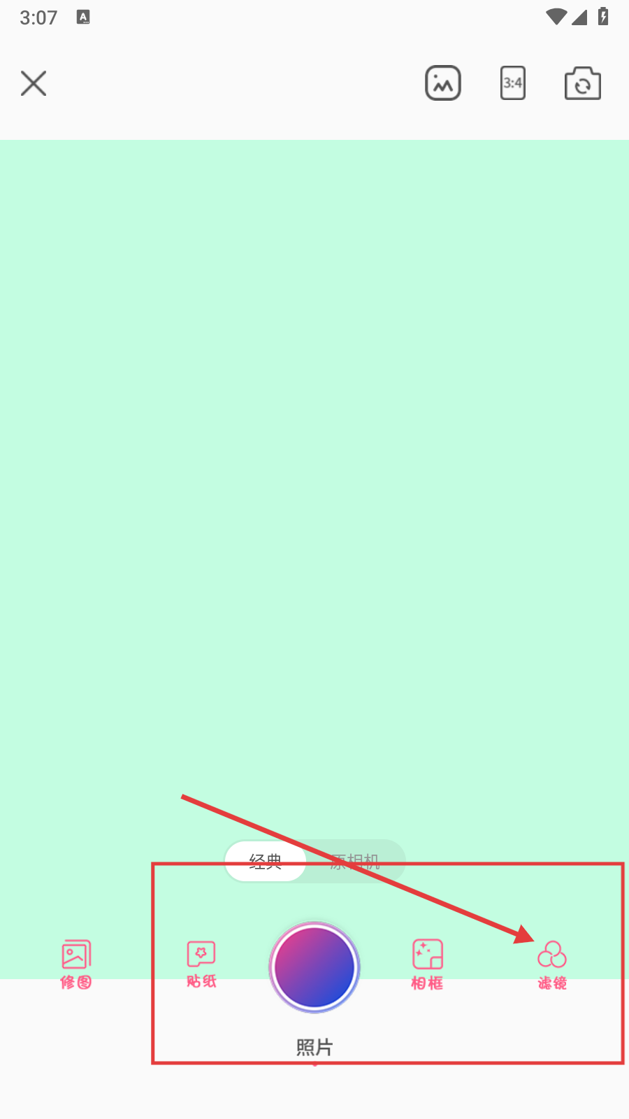 3、在相机页面中,找到并点击【滤镜】选项,打开滤镜选择栏,准备选择滤镜效果。