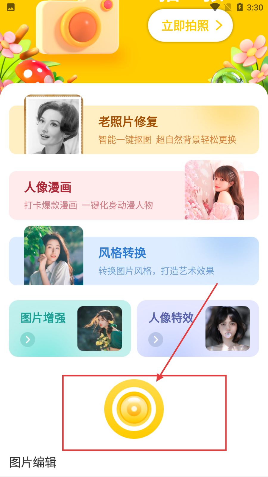 2、进入软件主界面后,可看到【老照片修复】【人像漫画】等功能,点击底部黄色圆形按钮,进入拍摄或编辑页面。