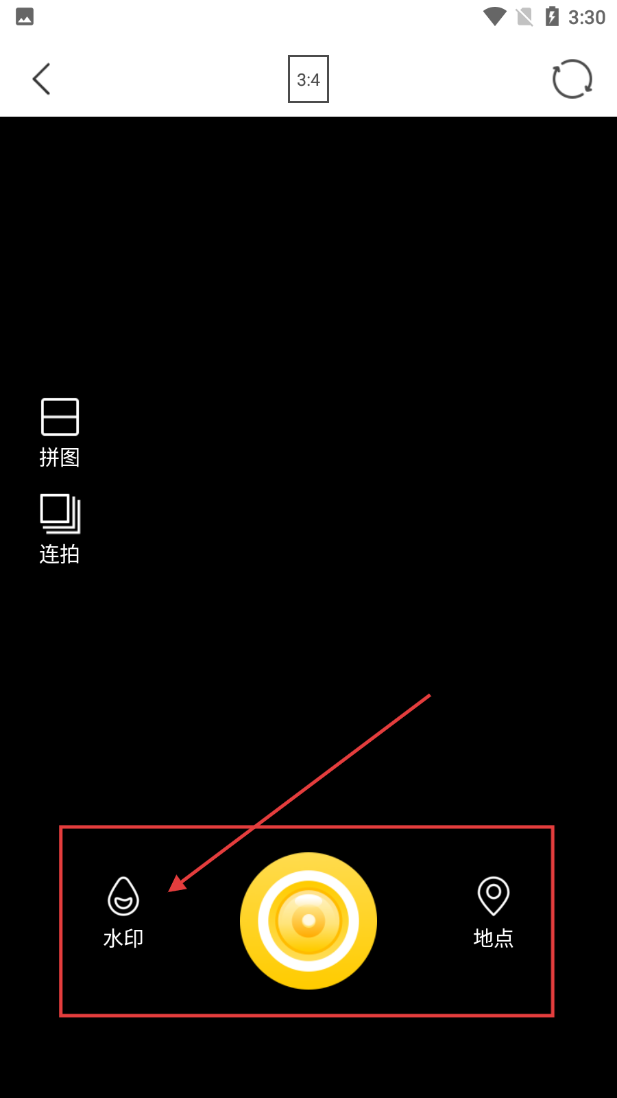 3、在拍摄页面中,找到并点击【水印】选项,打开水印选择栏,准备添加水印。