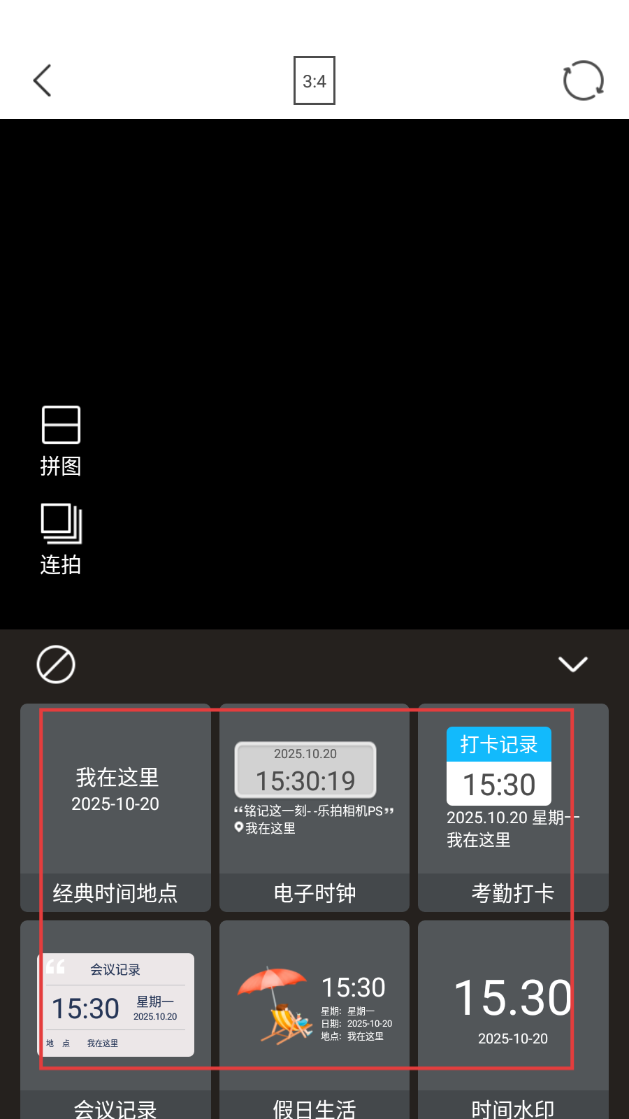 4、打开水印选择栏后,可看到【经典时间地点】【电子时钟】等多种水印,选择喜欢的水印添加到图片中。