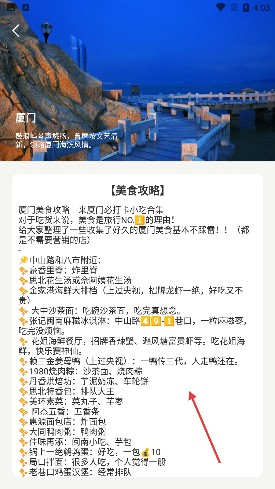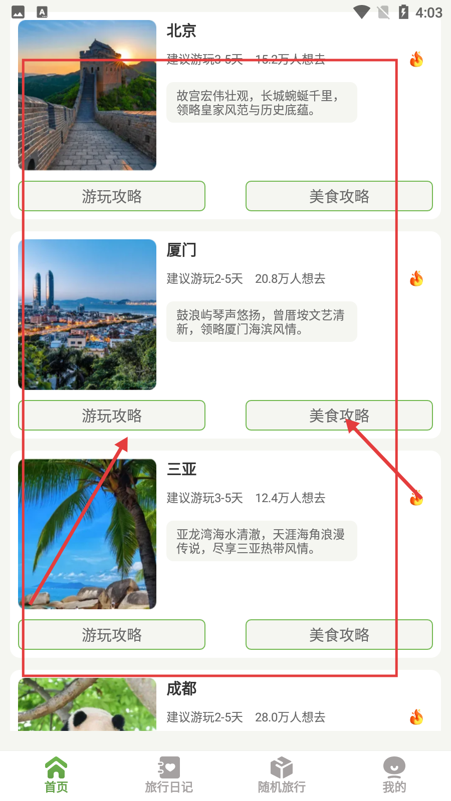 2、进入软件首页后,可看到北京、厦门等城市推荐,点击对应城市的【游玩攻略】或【美食攻略】按钮,比如点击【厦门】查看详细内容。