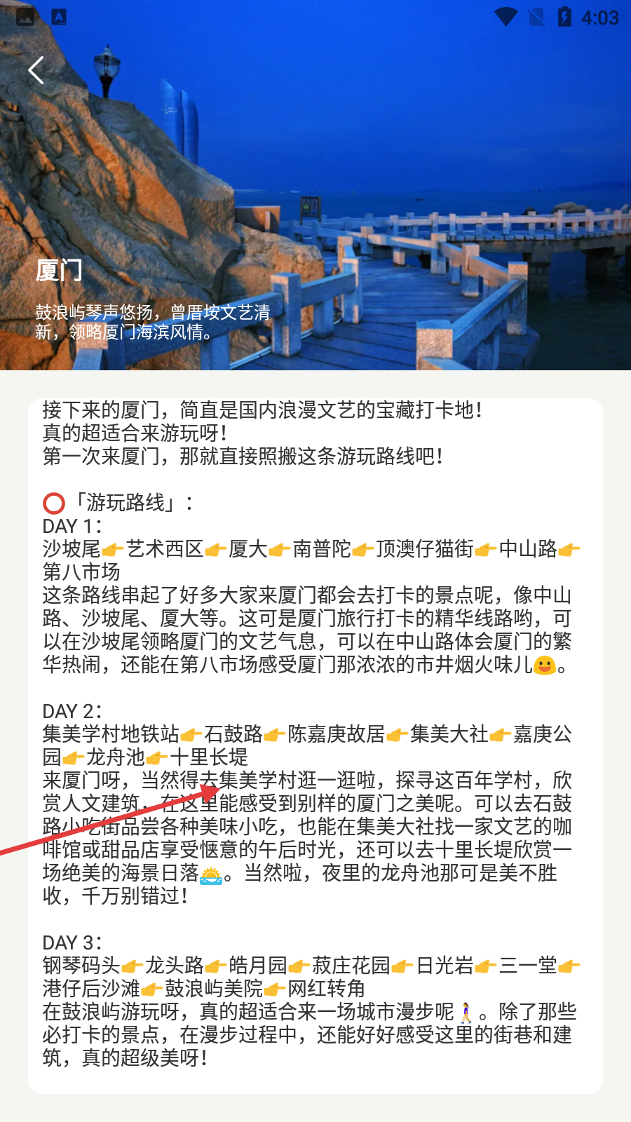 3、点击厦门的【游玩攻略】后,可查看详细游玩路线,如沙坡尾、集美学村等景点的打卡路线。