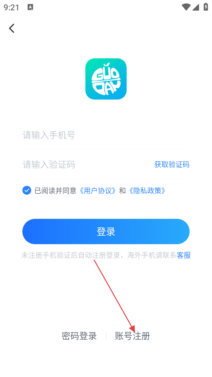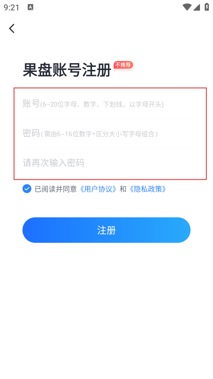 4、进入果盘账号注册页面,按要求填写账号、密码等信息,勾选同意相关协议后,点击【注册】按钮。