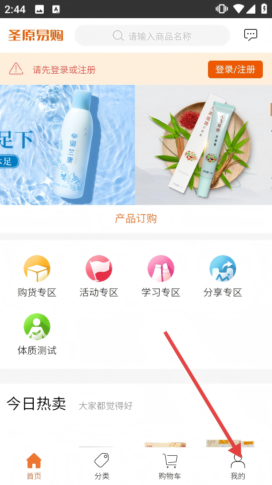 4、注册或登录后,即可在圣原易购首页使用购货、活动等专区功能,进行产品订购等操作。