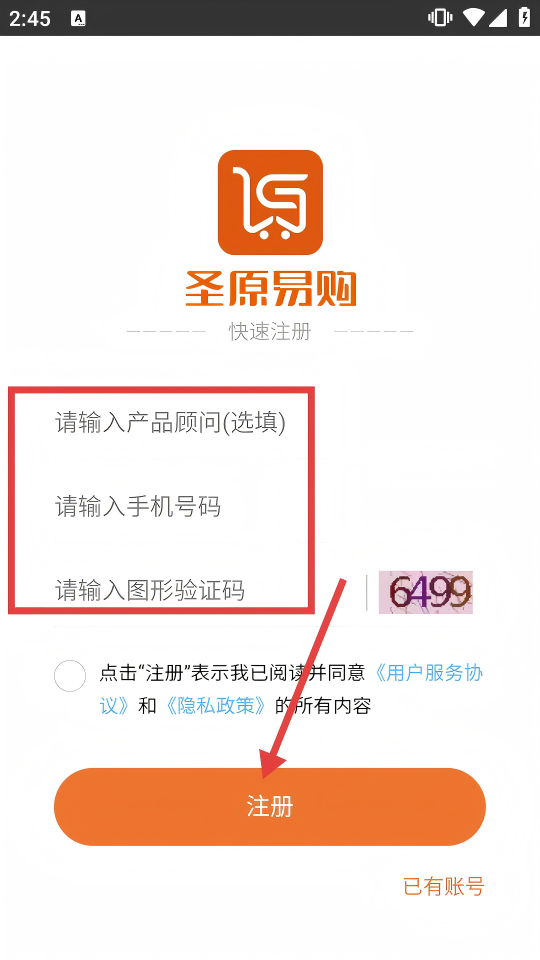 3、进入注册页,填写手机号码、图形验证码(选填产品顾问),勾选协议后点击【注册】。