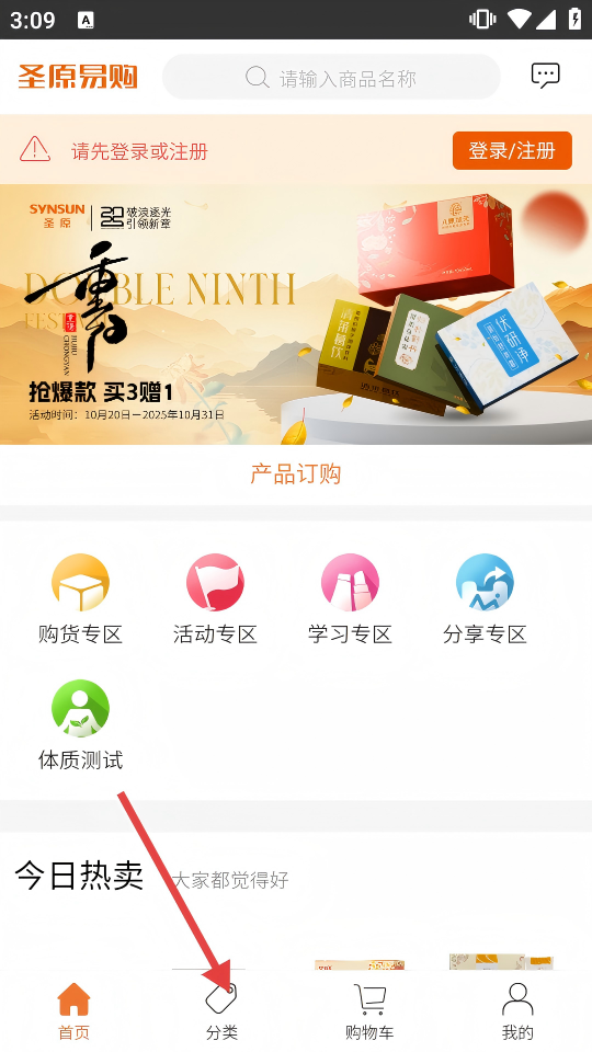 1、进入圣原易购首页,点击底部【分类】,进入商品分类页面。