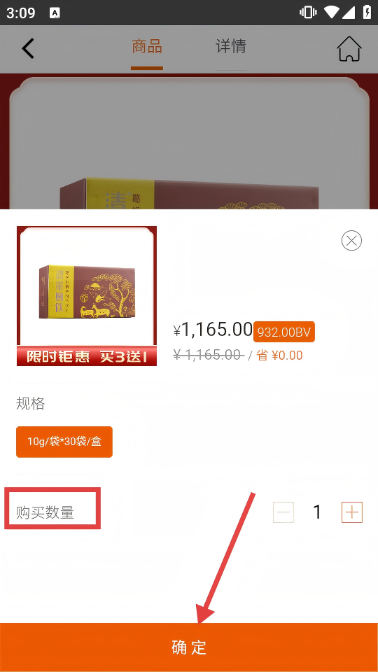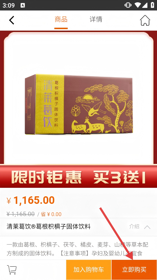 3、在商品详情页,点击【立即购买】,进入购买数量选择界面。