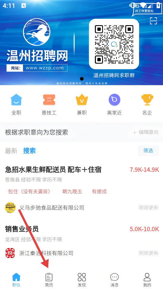 1、进入温州招聘网首页,点击底部【简历】,进入简历板块,可查看各类求职人员简历列表。
