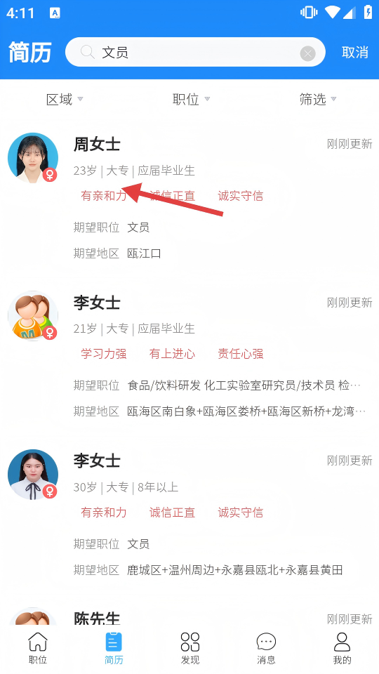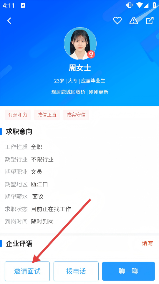3、点击目标简历(如周女士的简历),进入简历详情页,查看求职意向、个人特质等信息。