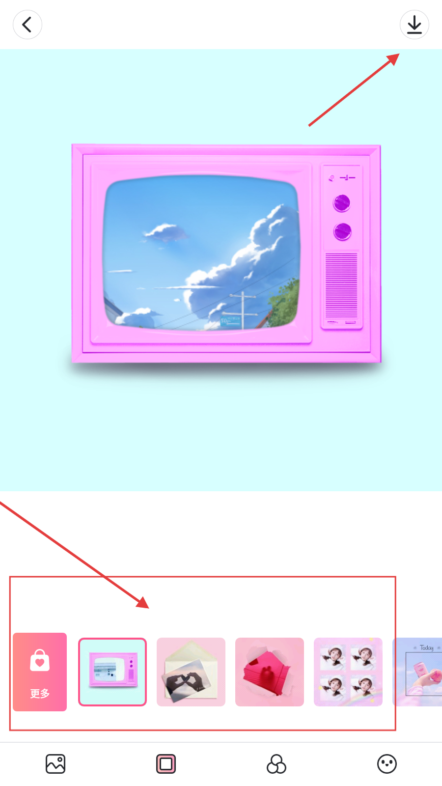 3、在图片编辑界面,可选择底部模板(如粉色电视机样式)进行编辑,完成后点击右上角下载按钮。