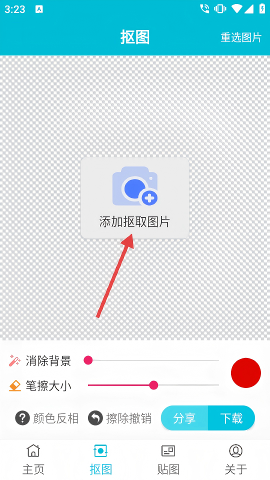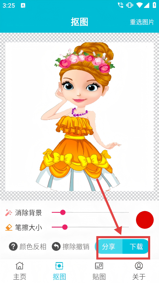 4、抠图完成后,可调节【消除背景】【笔擦大小】参数,操作后点击【分享】或【下载】保存抠图结果。