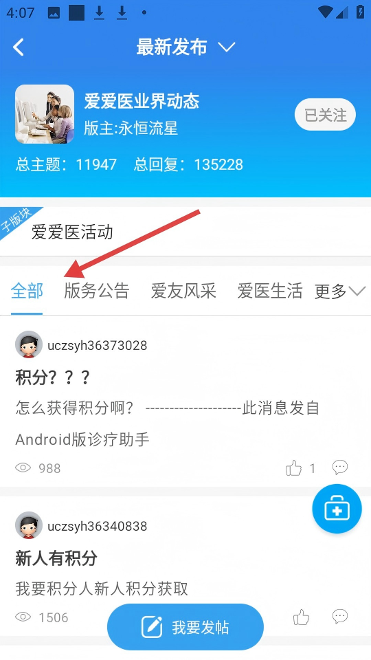 4、在爱爱医业界动态板块可查看【全部】分类下的帖子。