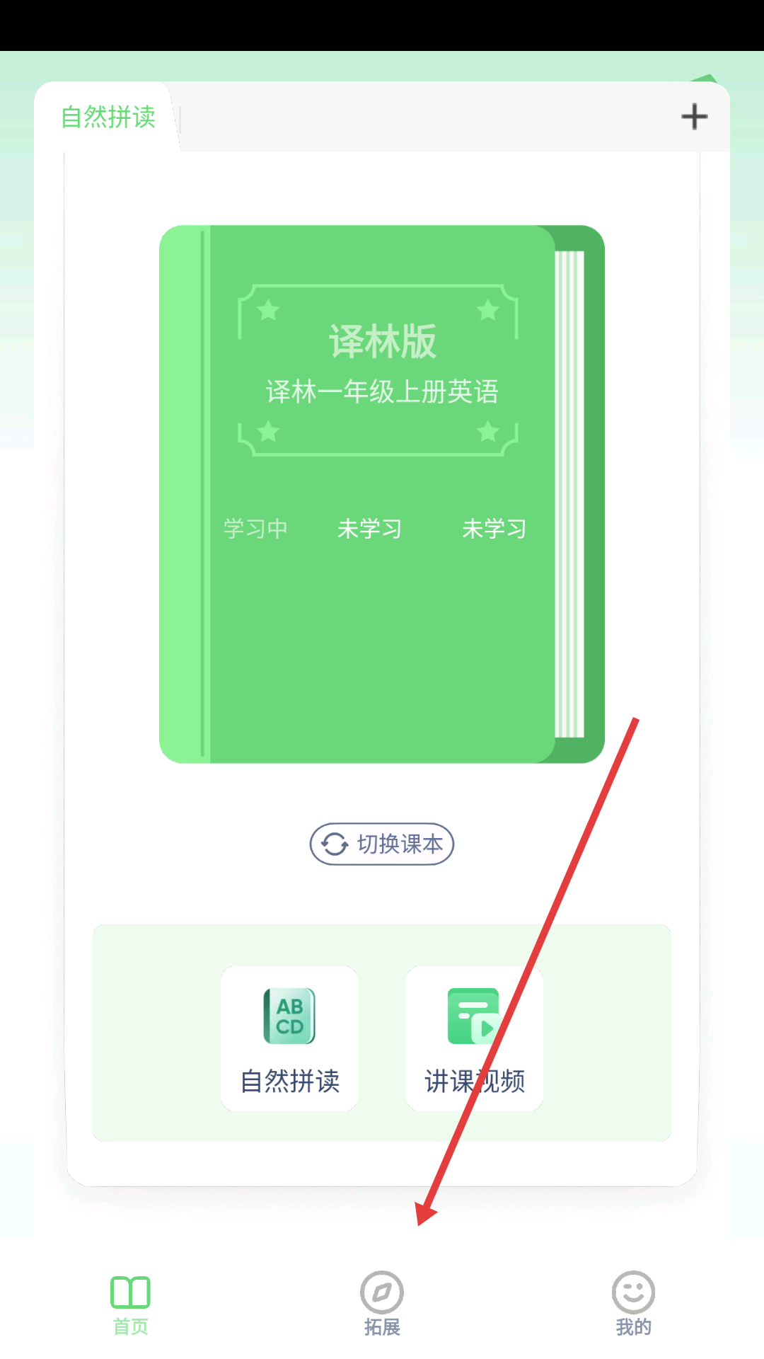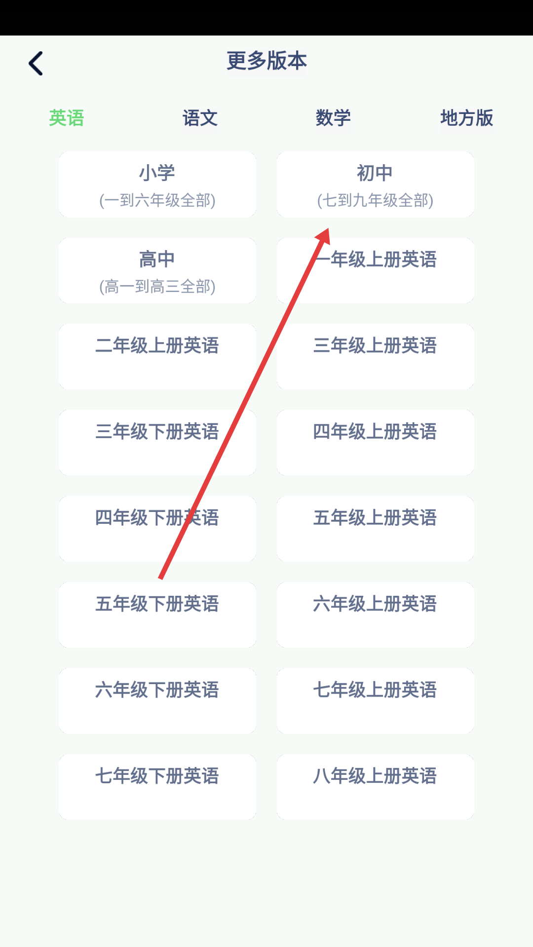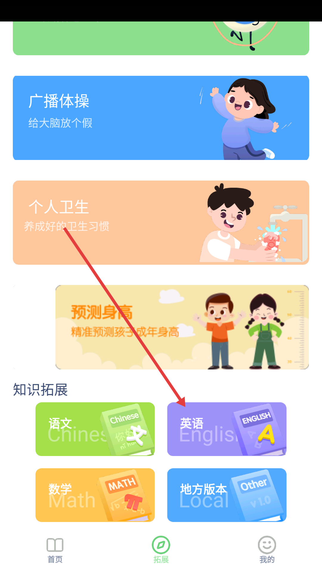 2、在拓展页面点击【英语】,进入更多版本页面。