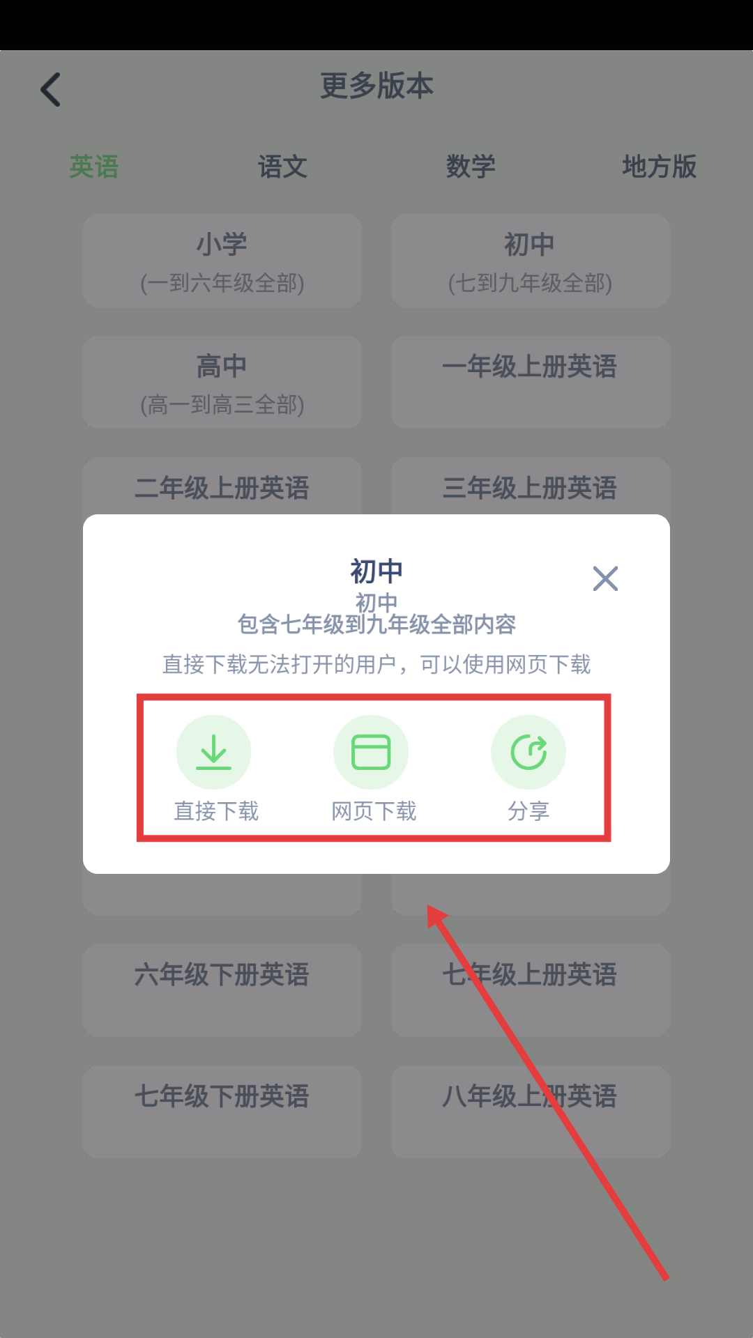 4、在弹窗中选择【直接下载】、【网页下载】或【分享】,获取初中英语内容。