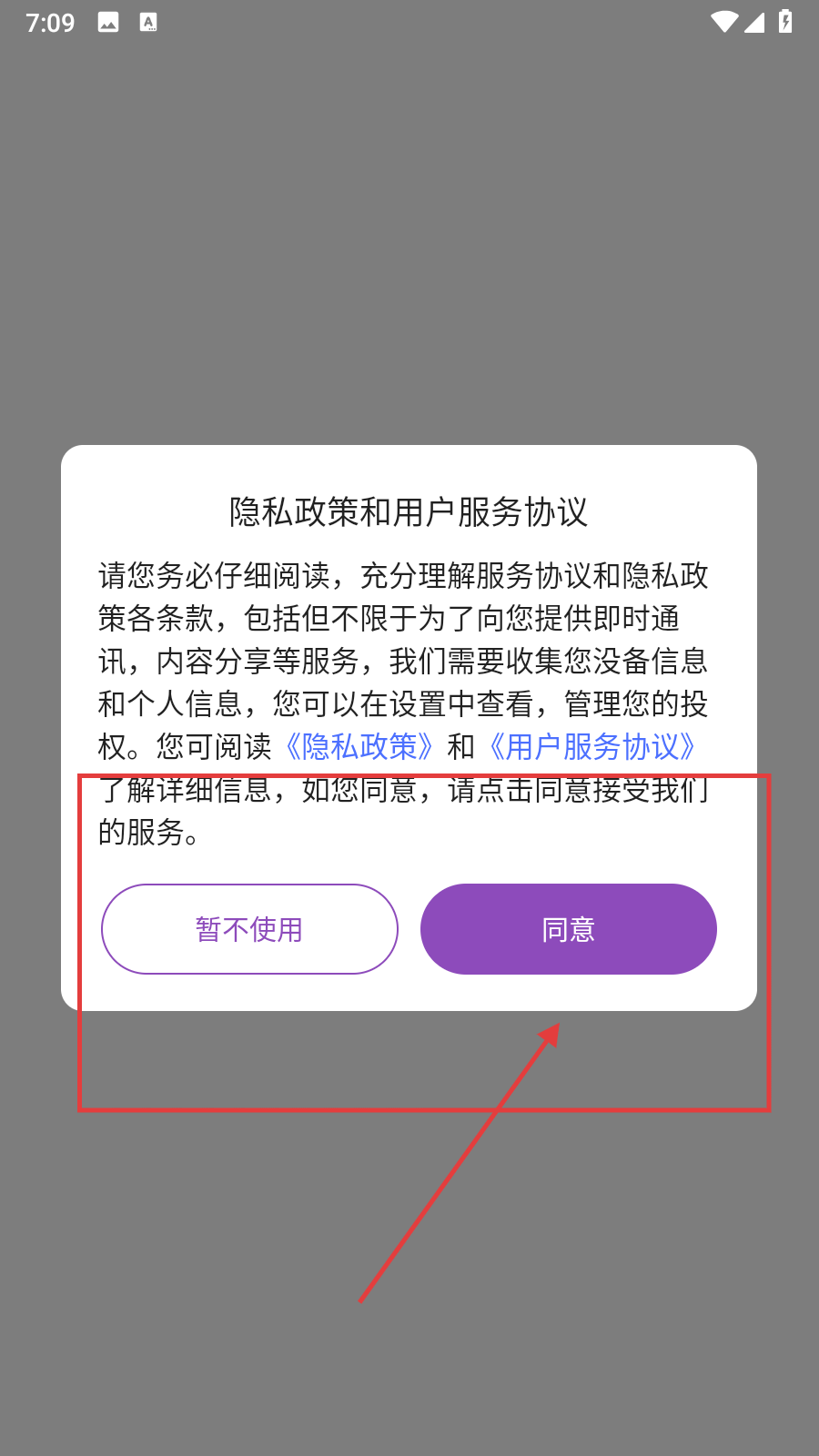 1、进入软件后,在【隐私政策和用户服务协议】弹窗中点击【同意】,进入登录选择页面。