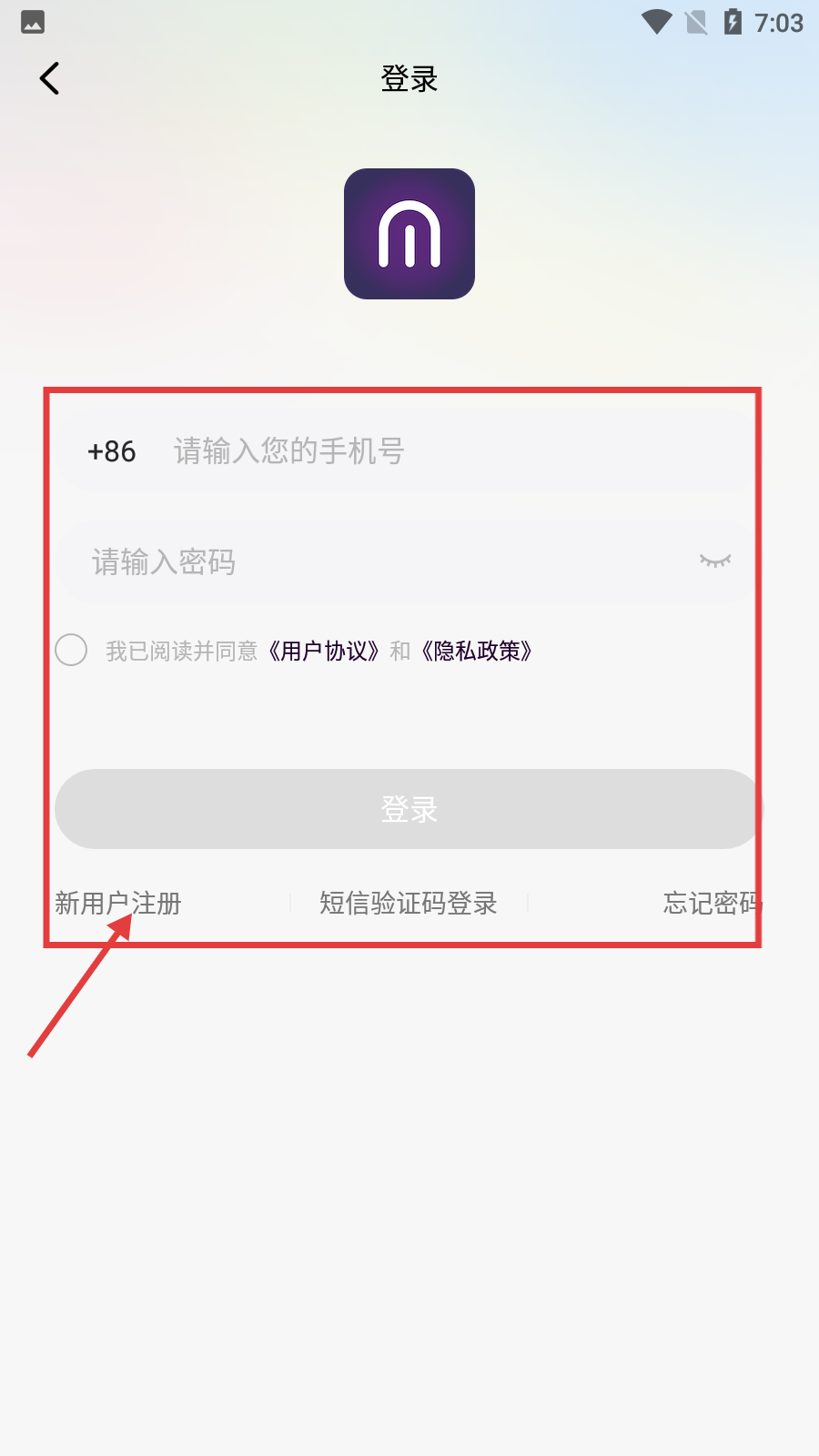 2、在登录选择页面,点击【新用户注册】选项,进入手机号注册界面。