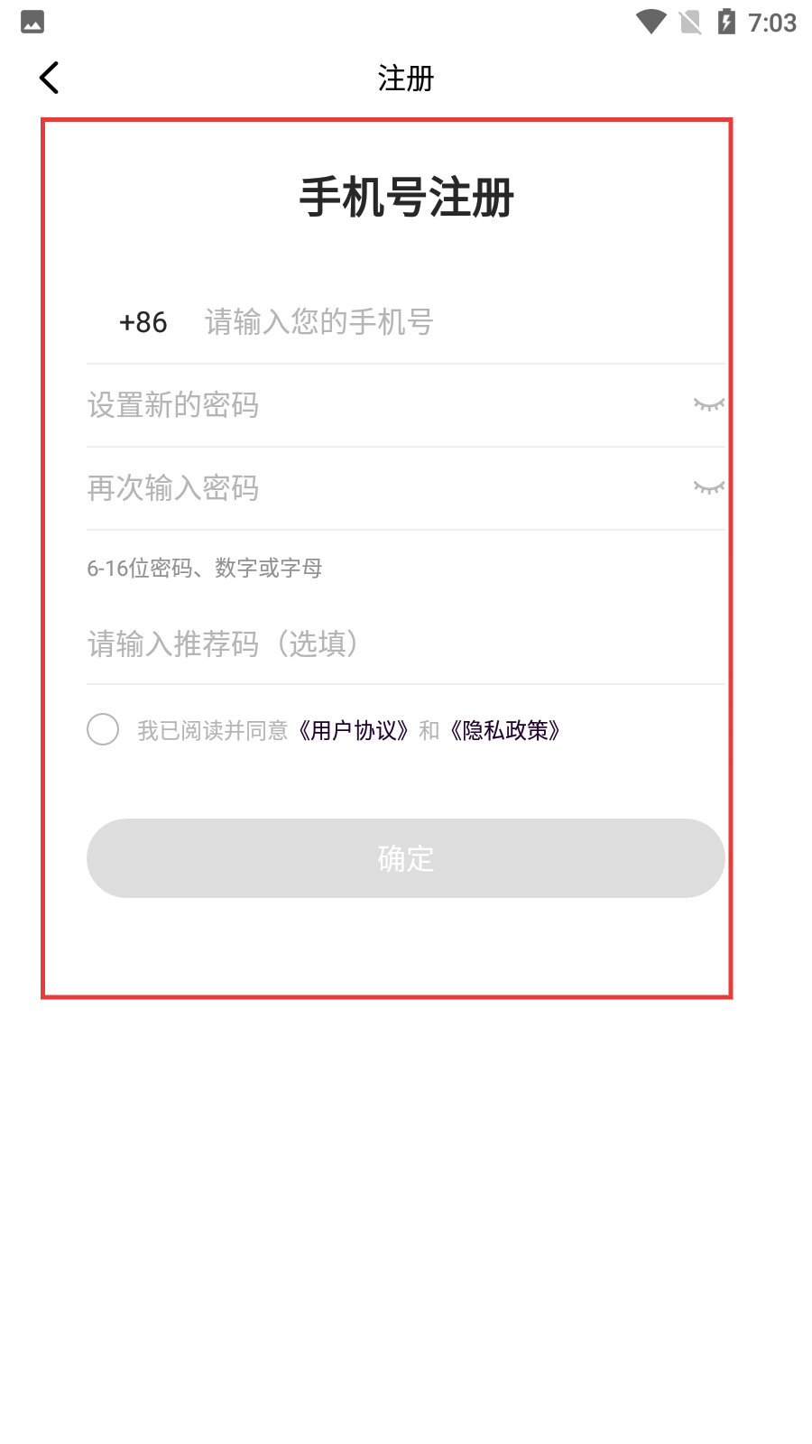 3、在手机号注册界面,输入手机号,设置并确认新密码,填写推荐码(选填)。