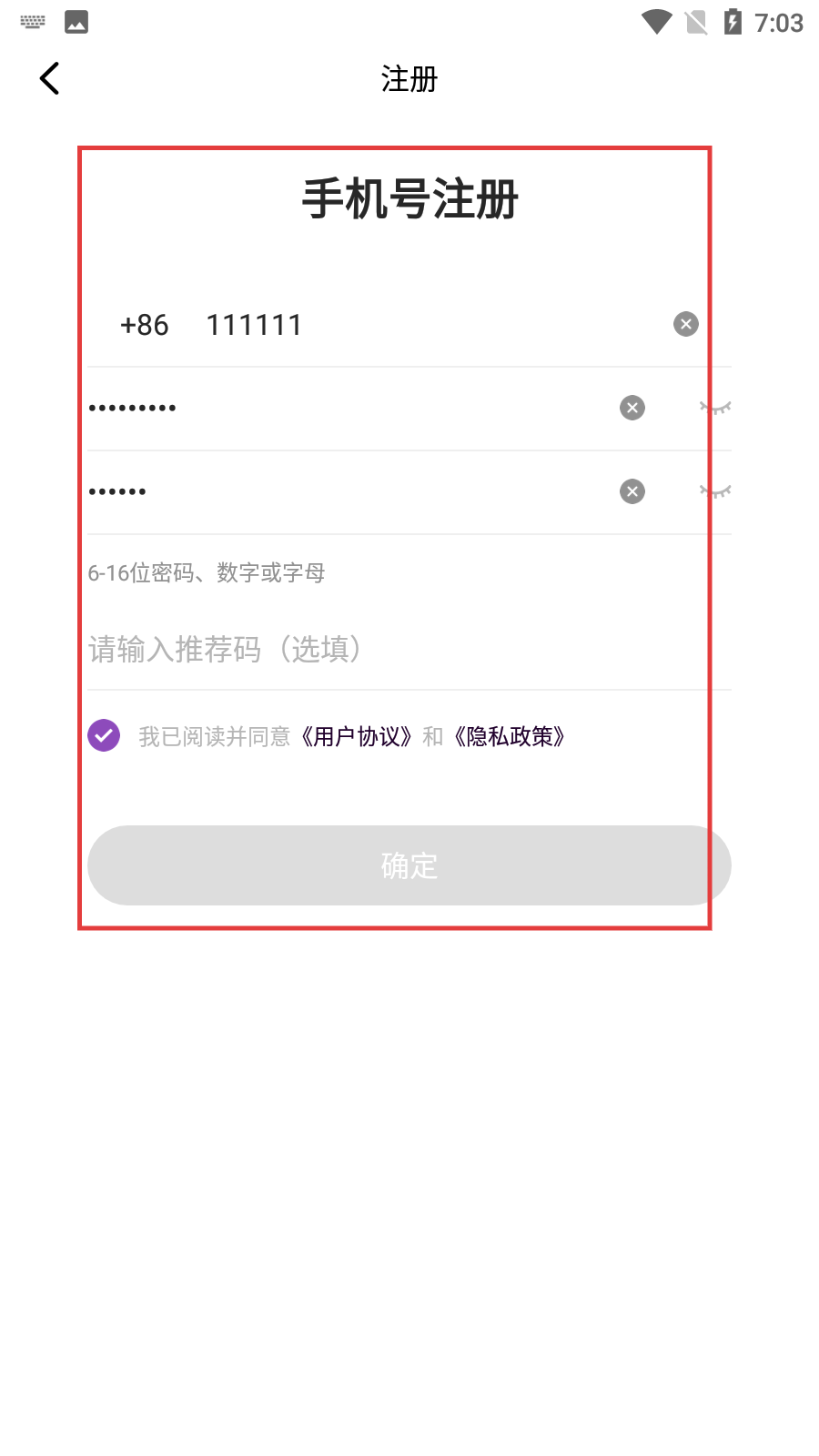 4、勾选【我已阅读并同意《用户协议》和《隐私政策》】后,点击【确定】按钮,即可完成注册。