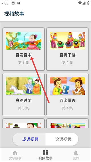 1、在文字故事界面,点击底部【视频故事】选项,进入视频故事板块,可查看成语视频、论语视频等分类内容。