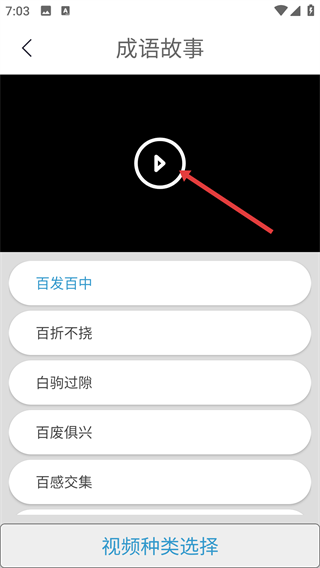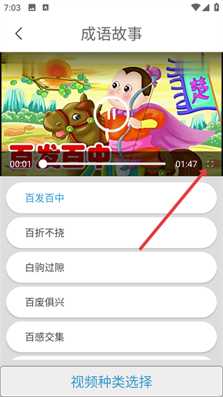 2、在视频故事的成语视频列表中,点击感兴趣的成语视频,如【百发百中】,进入该成语故事的播放界面。