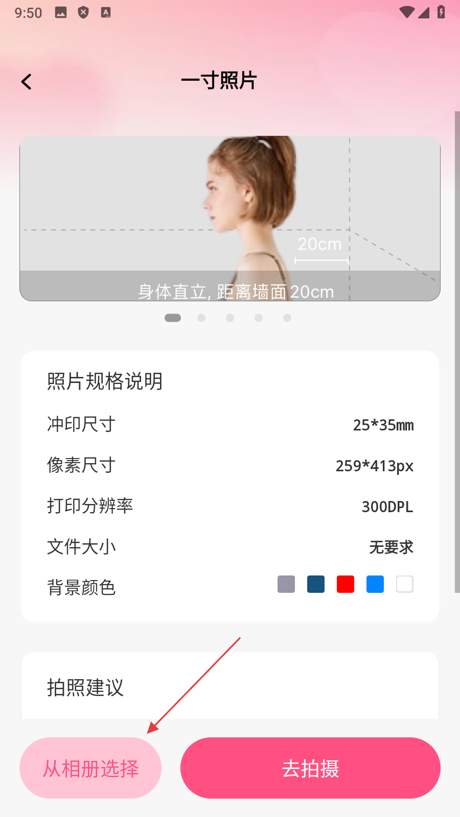 2、在一寸照片设置页面,点击【从相册选择】,进入相册选择页面。