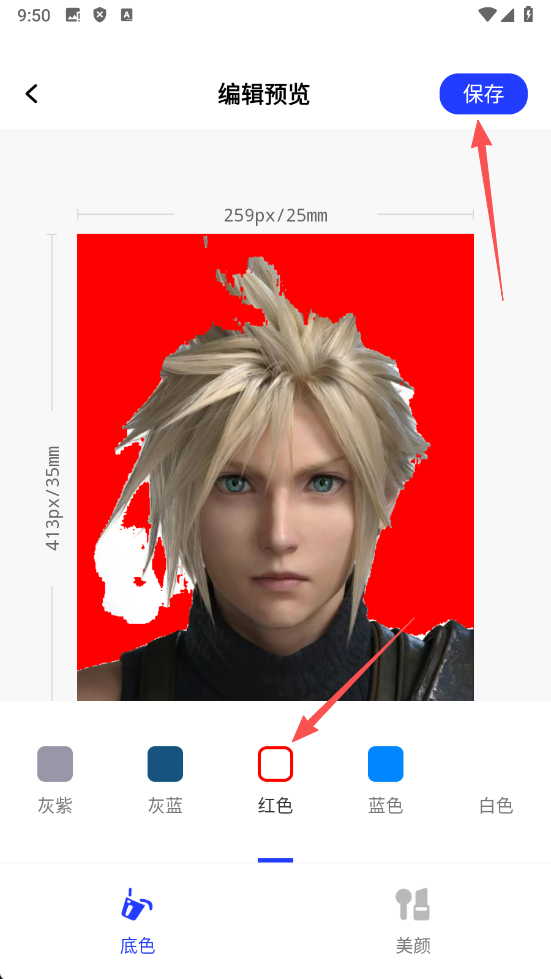 4、在编辑预览页面,【选择底色】后点击【保存】,即可完成电子证件照编辑保存操作。