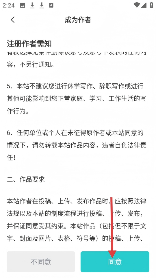 3、在成为作者的注册须知页面,点击【同意】按钮。