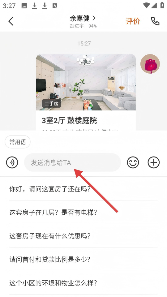 4、与中介【余嘉健】沟通【3室2厅鼓楼庭院】时,用常用语快速发消息咨询房源情况。