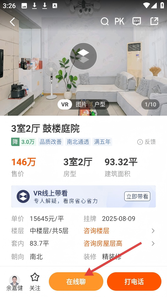 3、在【3室2厅鼓楼庭院】详情页点击【在线聊】或打电话联系中介咨询房源。