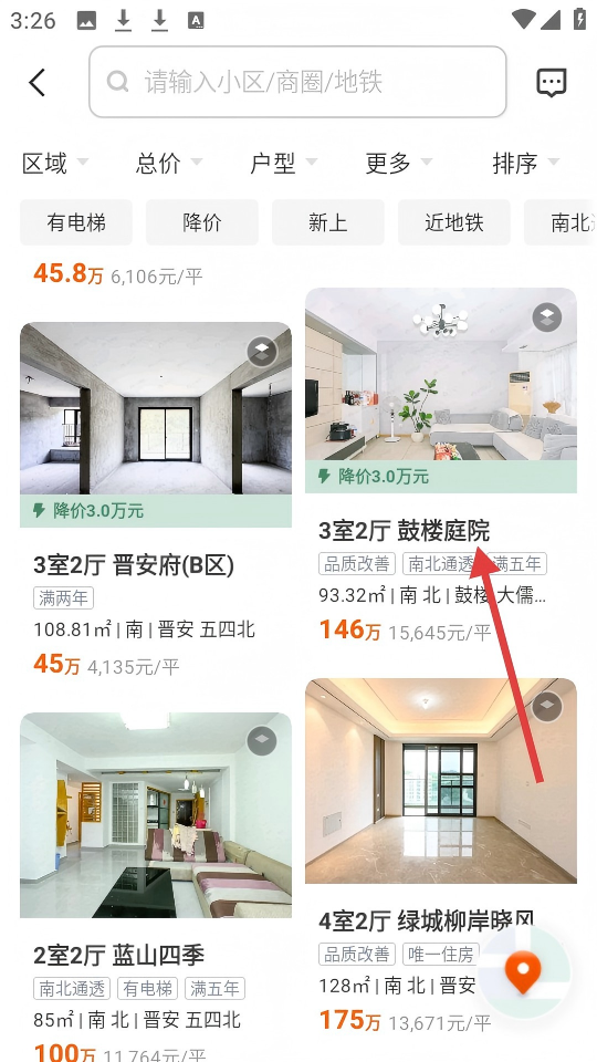 2、通过筛选条件找到【3室2厅鼓楼庭院】这类符合需求的房源。