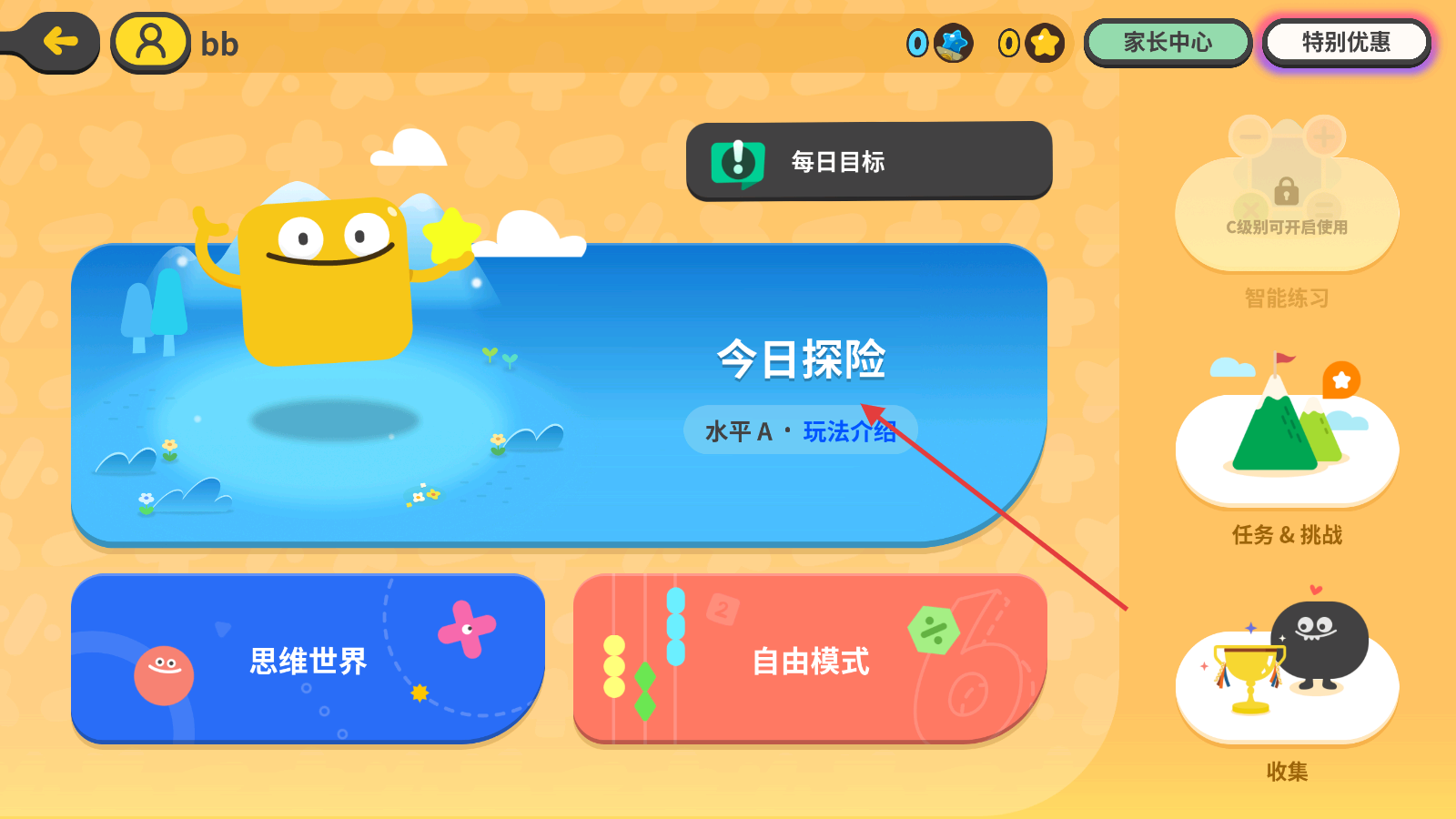 1、进入主界面后,可参与【今日探险】,其为水平A玩法,还可选择【思维世界】【自由模式】,右侧有【智能练习】等功能入口。