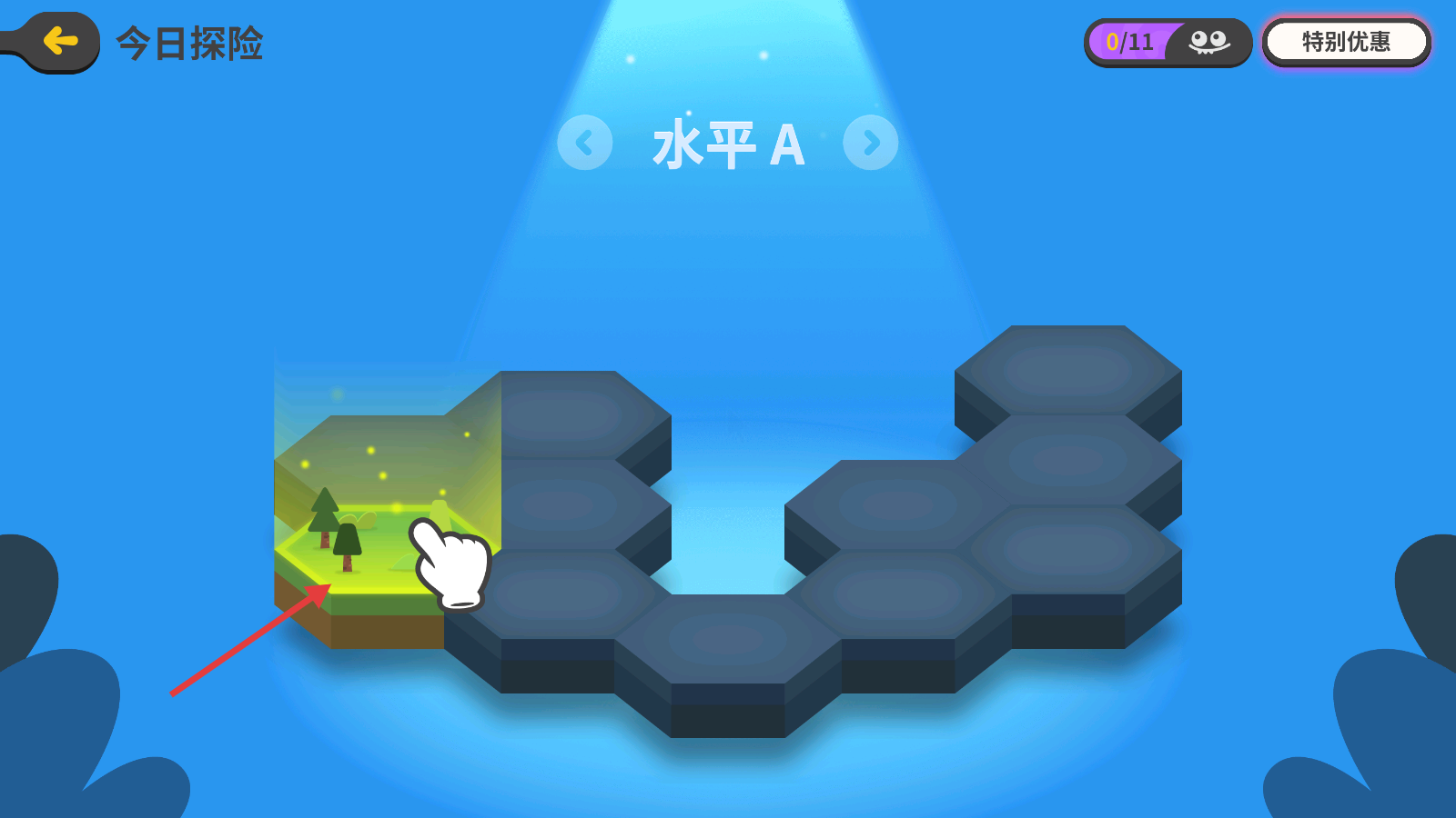 2、在【今日探险】的水平A界面,按照指引点击带有树木的区域,开启探险关卡。