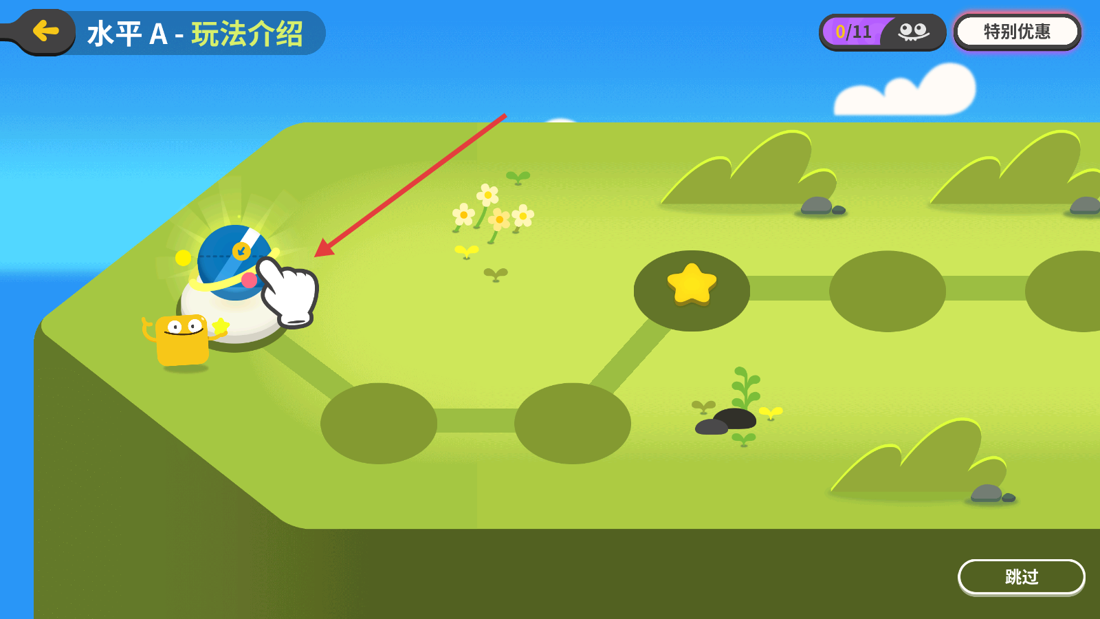 3、在【水平A-玩法介绍】中,跟随指引点击蓝色装置,了解玩法规则,也可点击右下角【跳过】按钮直接进入游戏。