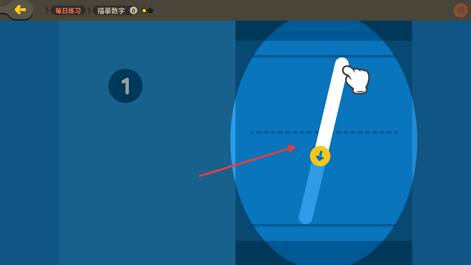 4、在【描摹数字】的每日练习中,按照指引的轨迹描摹数字“1”,完成数字描摹练习。