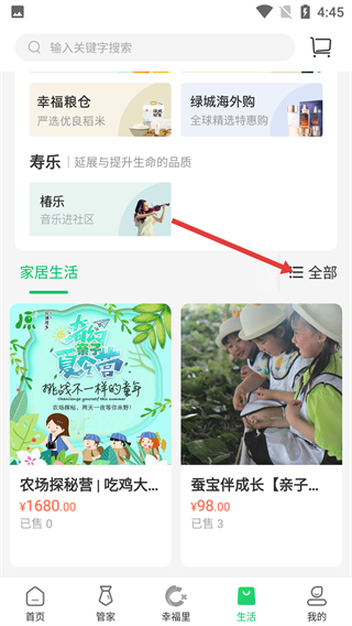 2、在生活服务页面的【家居生活】板块点击【全部】,进入家居生活商品列表页面。