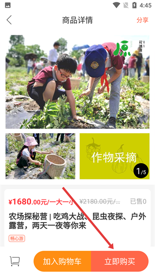 4、在商品详情页面点击【立即购买】,可完成该农场探秘营商品的购买流程。