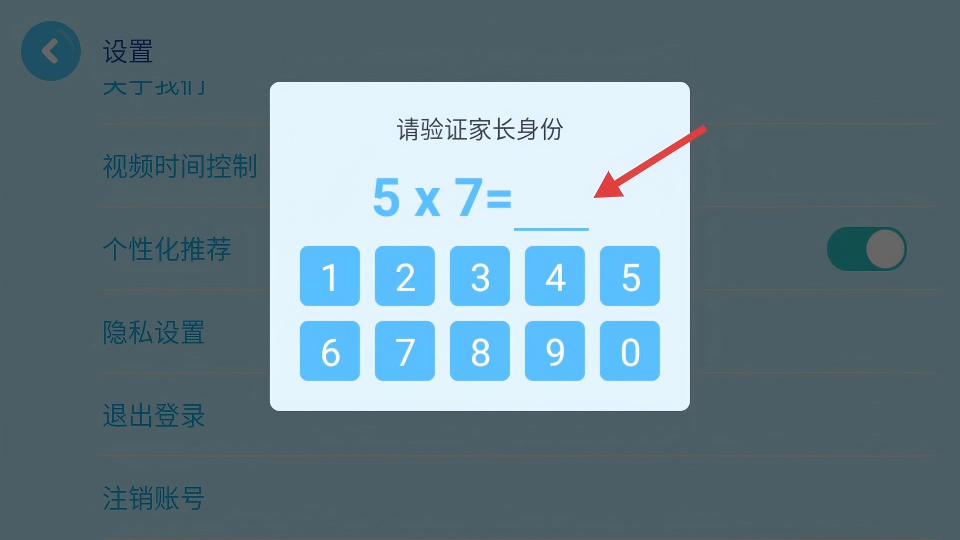 3、在【请验证家长身份】环节,需计算5×7,得出结果35后输入即可通过验证。