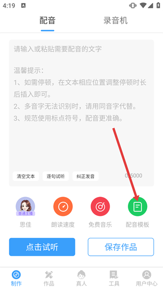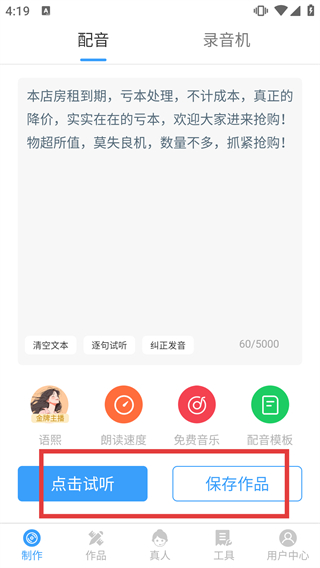 4、在编辑页面点击【点击试听】确认效果后,点击【保存作品】,完成配音制作,可用于广告宣传、语音提示等场景。
